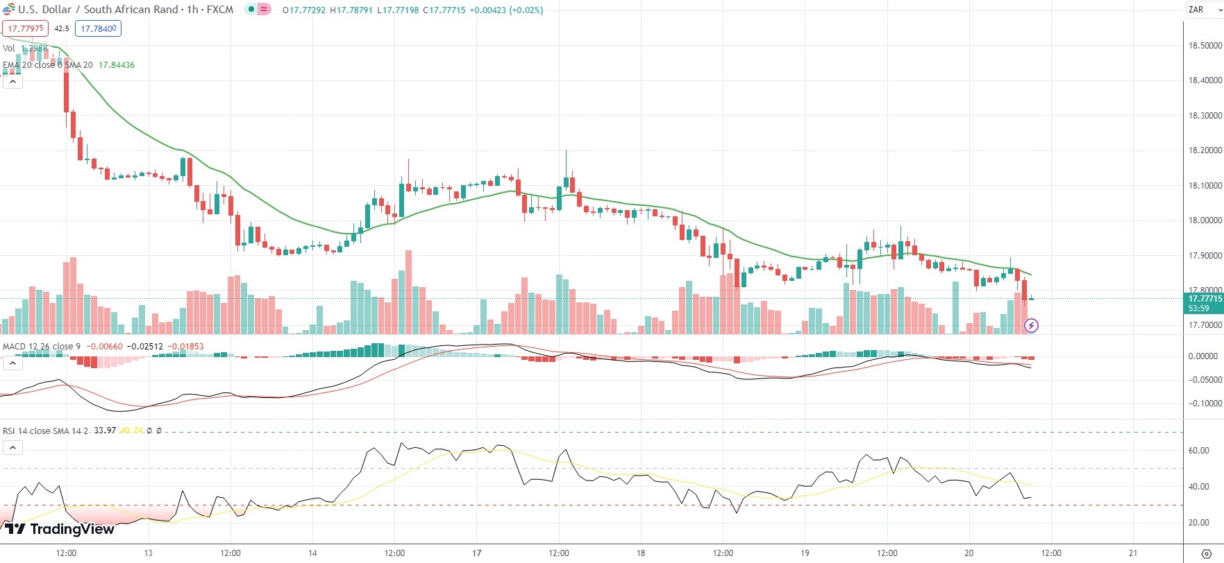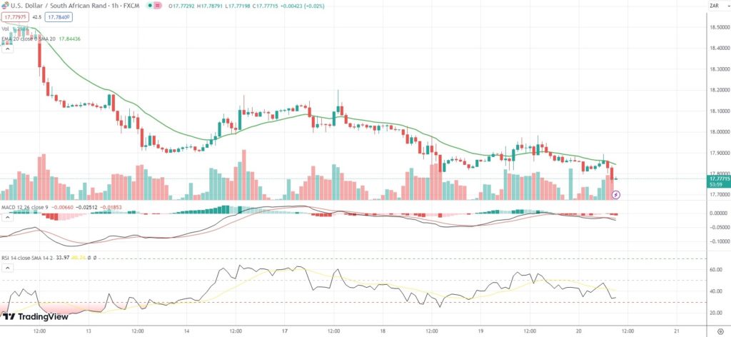 As of 9:05 GMT on Thursday USD/ZAR was edging down 0.41% to trade at 17.7823. Earlier in the session, the exotic Forex pair went down as low as 17.7527. The latter has been the pair’s weakest level since April 4th (17.7509).
