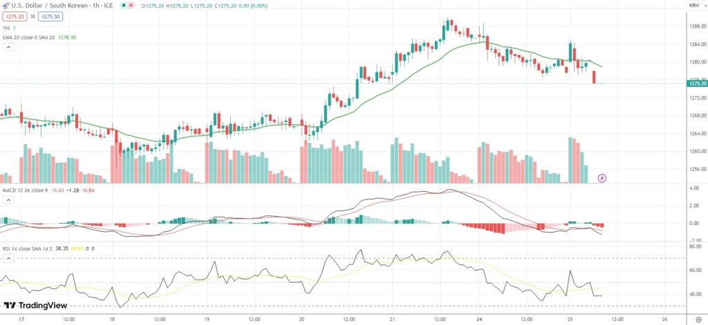 As of 9:21 GMT on Tuesday USD/KRW was edging down 0.32% to trade at 1275.20. Last Friday, the exotic Forex pair went up as high as 1290.03. The latter has been the pair’s strongest level since July 12th (1295.72).