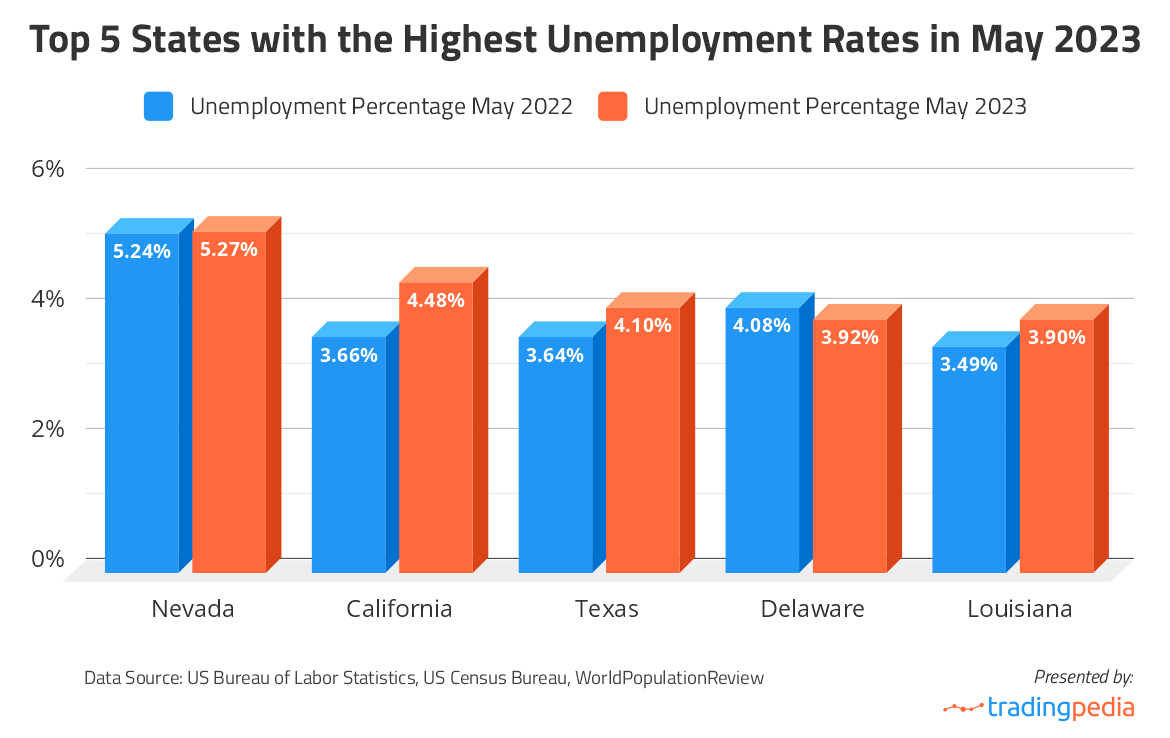 These considerable swings spurred the team at TradingPedia to further analyze the matter. The current report highlights the five states with the highest rates of unemployment. It also includes data on the five states with the lowest rates and the one which has achieved the strongest progress since May 2022.