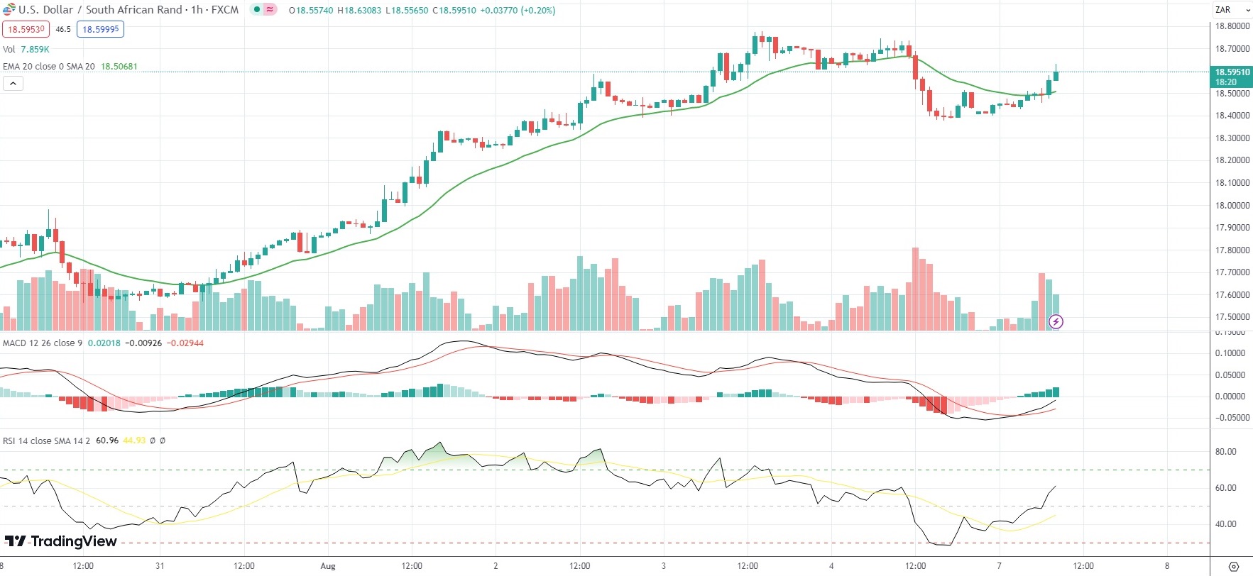 As of 8:41 GMT on Monday USD/ZAR was gaining 0.86% to trade at 18.5958. Last week, the exotic Forex pair went up as high as 18.7769. The latter has been the pair’s strongest level since July 11th (18.8022).