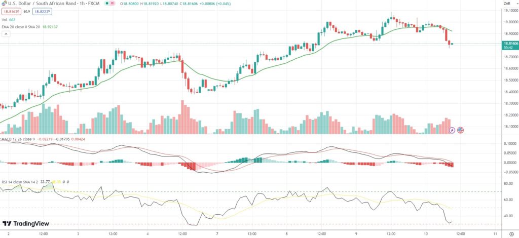 As of 9:03 GMT on Thursday USD/ZAR was losing 0.73% to trade at 18.8184. Yesterday the exotic Forex pair went up as high as 19.0849. The latter has been the pair’s strongest level since July 7th (19.1523).