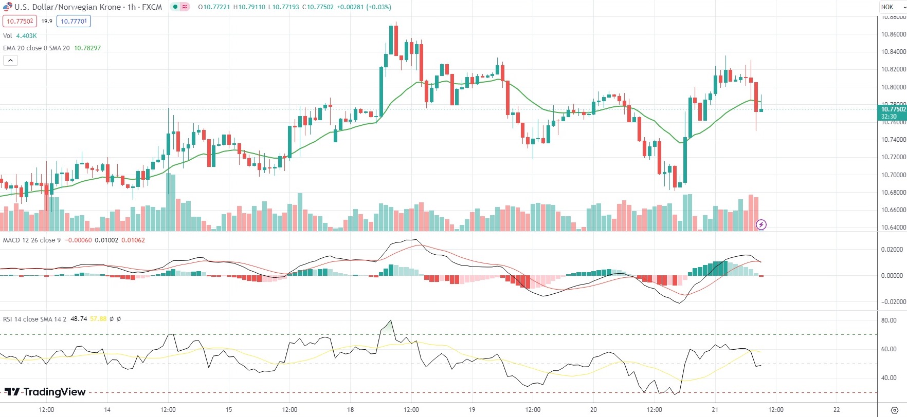 As of 9:26 GMT on Thursday USD/NOK was inching down 0.07% to trade at 10.7746. Earlier in the session, the exotic Forex pair slipped to an intraday low of 10.7492.