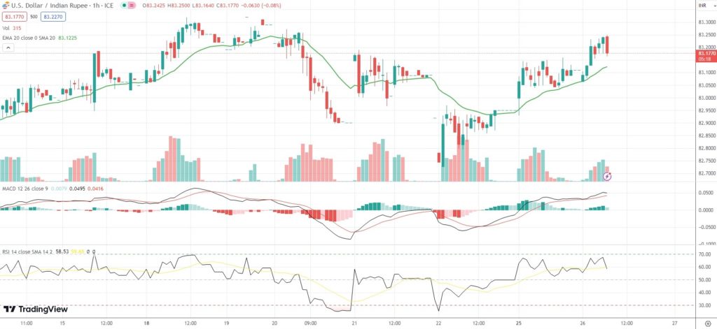 As of 7:54 GMT on Tuesday the USD/INR pair was edging up 0.14% to trade at 83.2225.