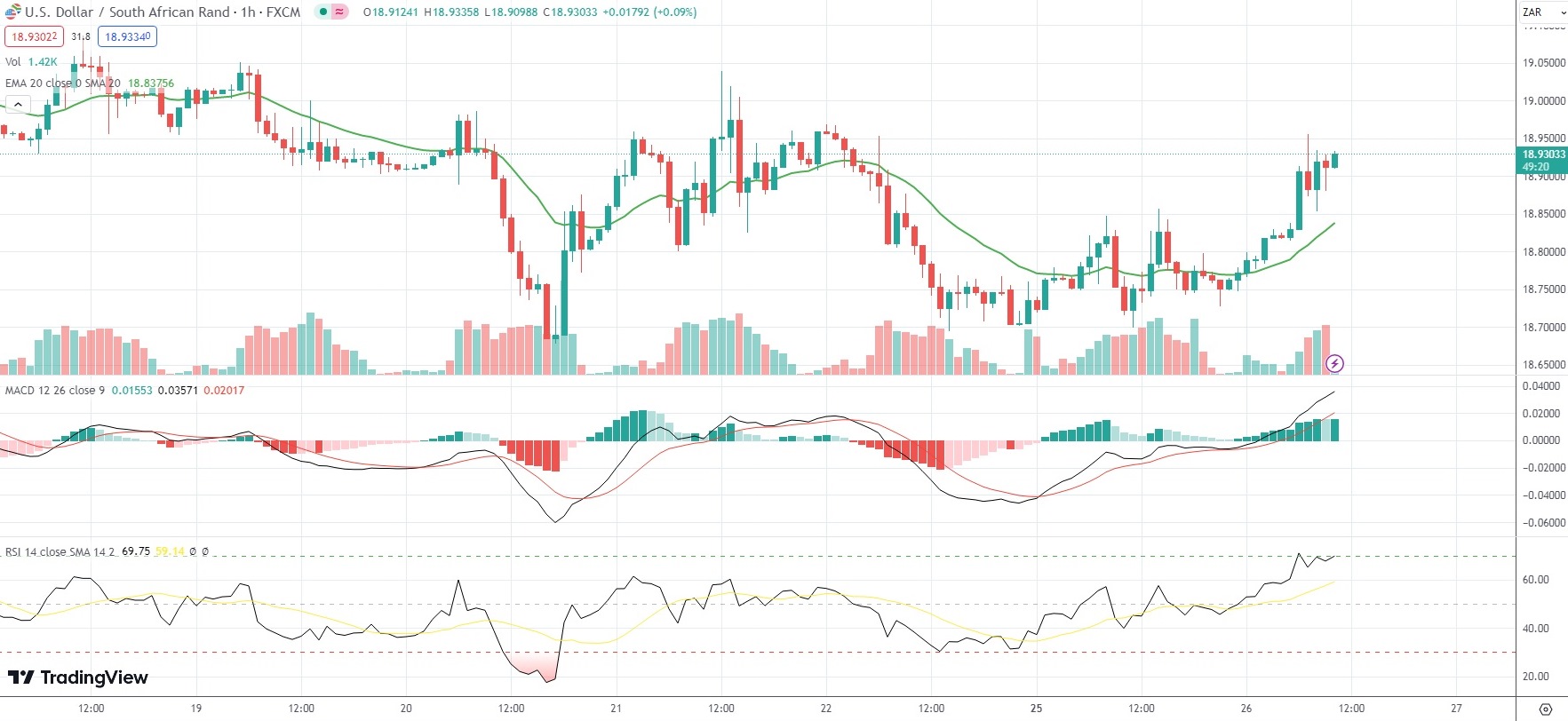 As of 10:10 GMT on Tuesday USD/ZAR was gaining 0.85% on the day to trade at 18.9220.