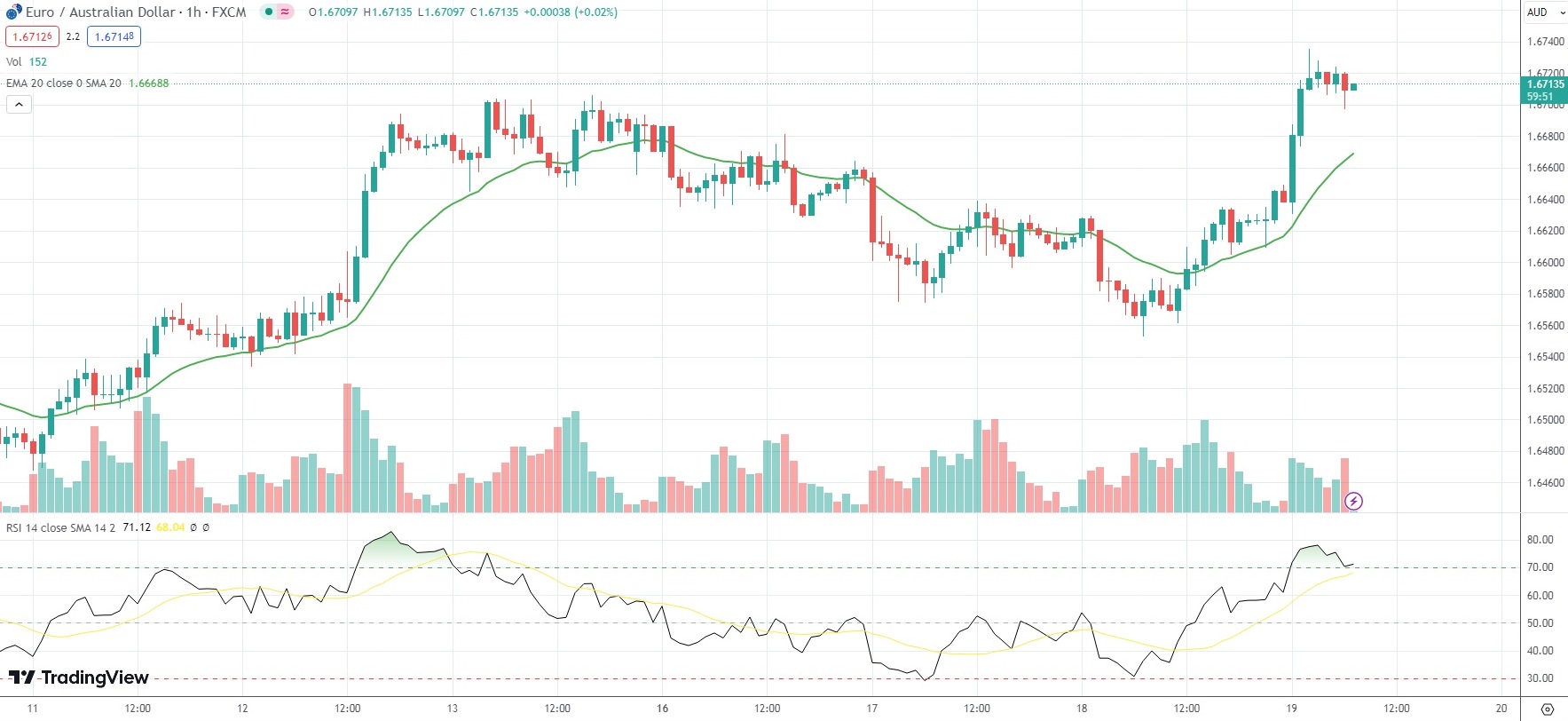 As of 6:59 GMT on Thursday EUR/AUD was gaining 0.49% to trade at 1.6709. Earlier in the session, the minor Forex pair went up as high as 1.6735. The latter has been the pair’s strongest level since September 13th (1.6795).