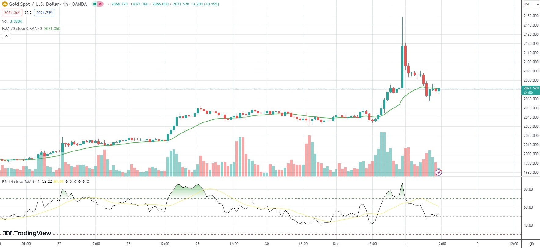 Having risen to a fresh all-time high of nearly $2,150 during Monday’s Asian session on rising expectations that the Federal Reserve could begin cutting interest rates next year, Spot Gold eased a bit, but continued holding above the $2,000 mark.