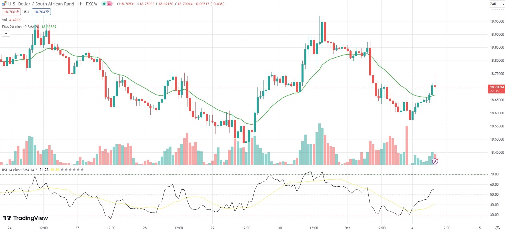 As of 8:31 GMT on Monday USD/ZAR was edging up 0.49% on the day to trade at 18.7009.