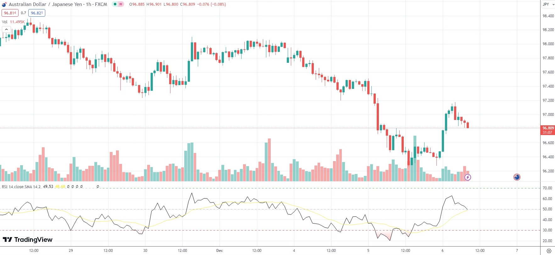 As of 8:28 GMT on Wednesday AUD/JPY was edging up 0.44% to trade at 96.823. Yesterday the minor Forex pair went down as low as 96.265. The latter has been the pair’s weakest level since November 13th (96.186).