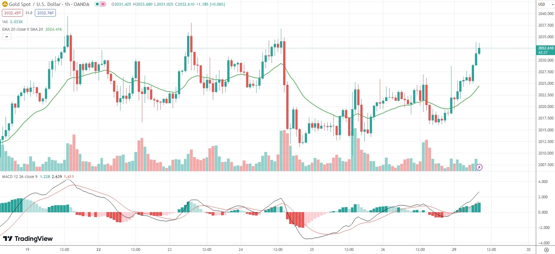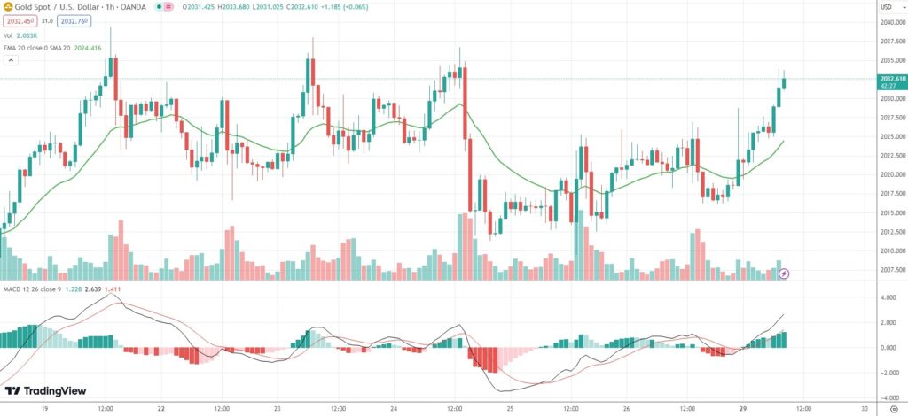 As of 8:16 GMT on Monday Spot Gold was gaining 0.68% to trade at $2,032.36 per troy ounce.