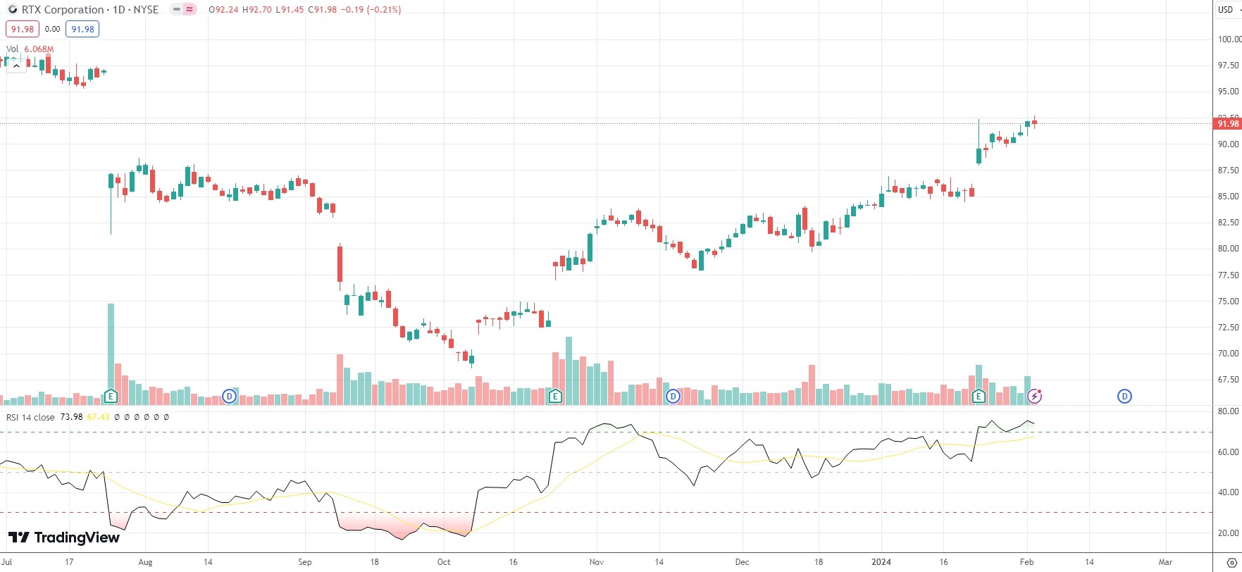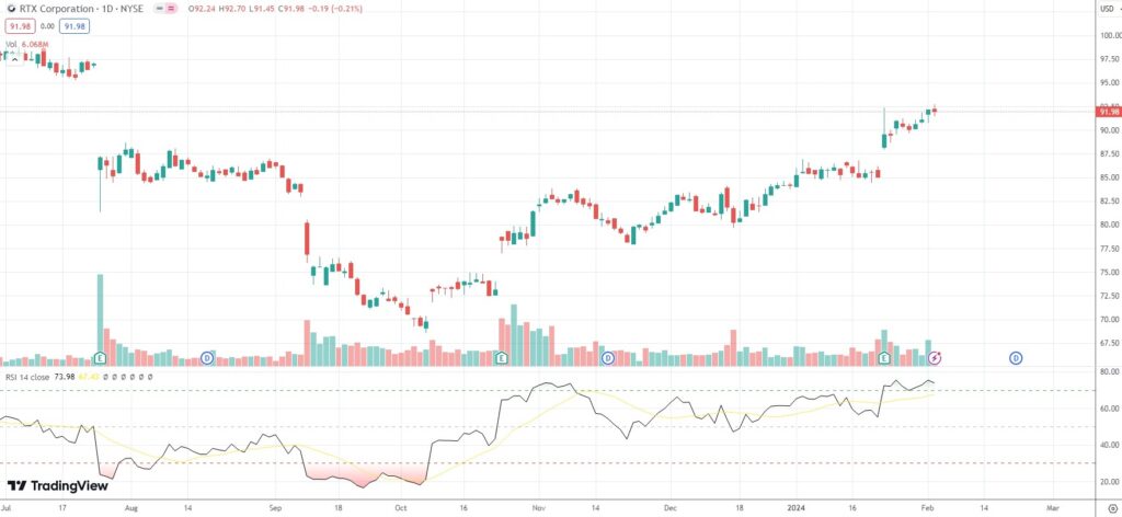 The shares of RTX Corp (RTX) closed 0.21% ($0.19) lower at $91.98 in New York on Friday, as they snapped a three-day streak of gains. This has been the highest closing price since July 24th 2023.