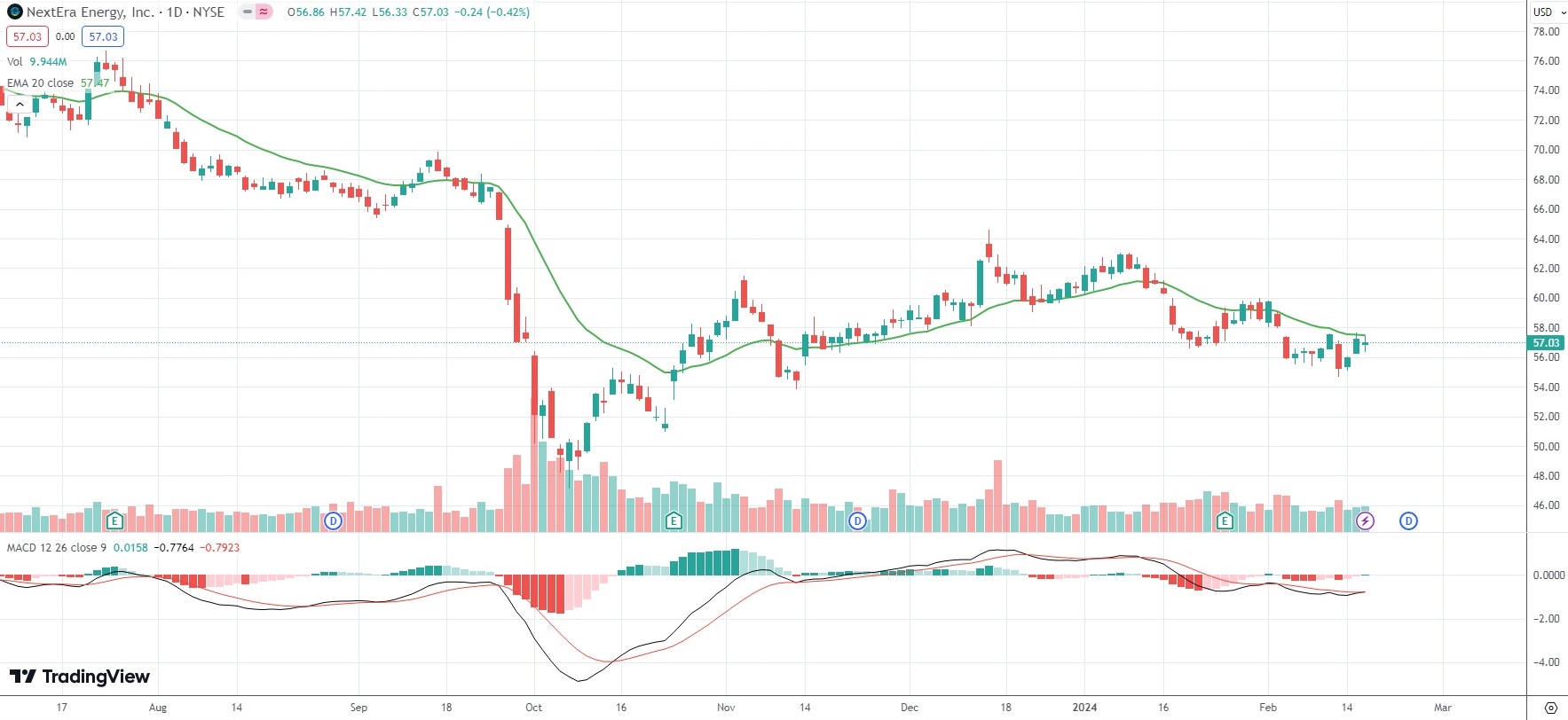 The shares of NextEra Energy Inc (NEE) closed 0.42% ($0.24) lower at $57.03 in New York on Friday, as they snapped a two-day streak of gains.