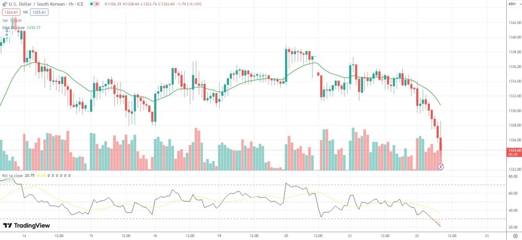As of 8:53 GMT on Thursday the USD/KRW currency pair was retreating 0.64% to trade at 1,324.54.
