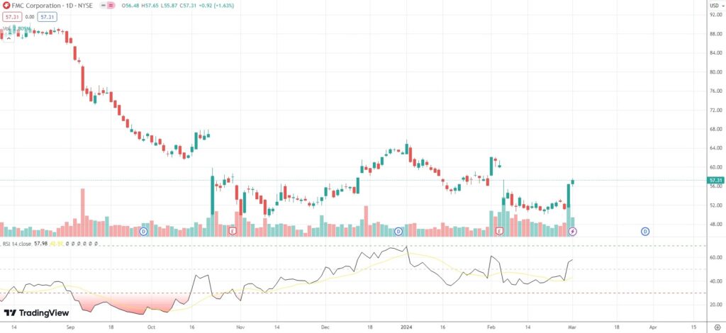 The shares of FMC Corporation (FMC) closed 1.63% ($0.92) higher at $57.31 in New York on Friday, as they extended the gain from the previous market session.