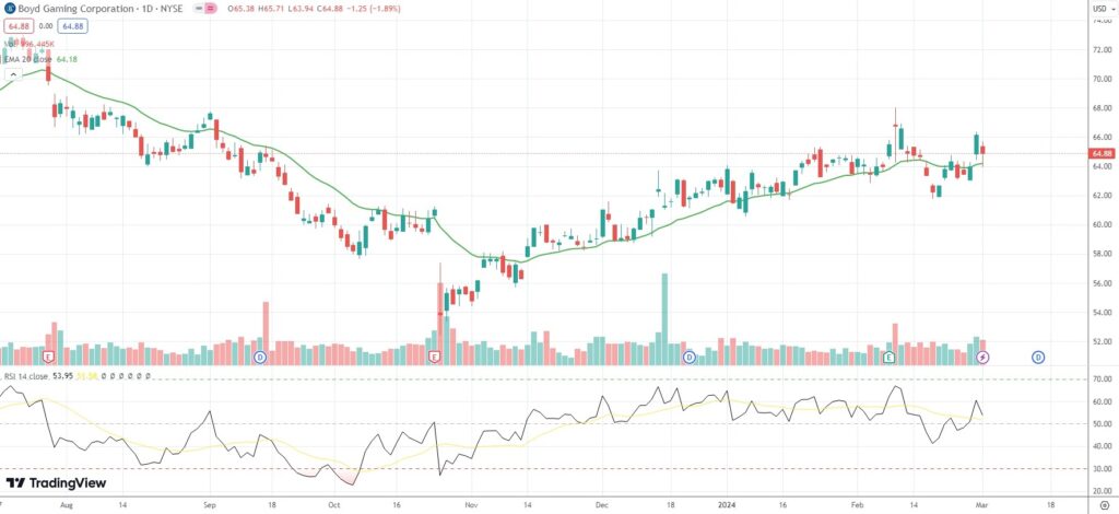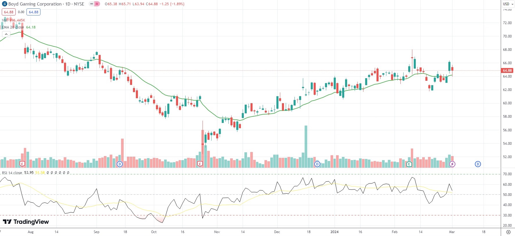 The shares of Boyd Gaming Corporation (BYD) closed 1.89% ($1.25) lower at $64.88 in New York on Friday, as they snapped a three-day streak of gains.