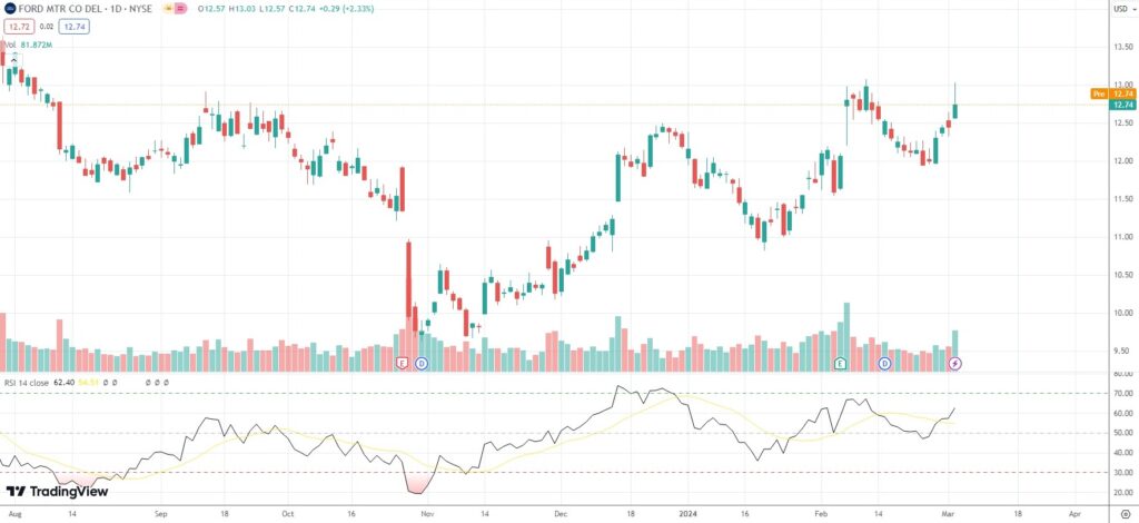 The shares of Ford Motor Company (F) closed 2.33% ($0.29) higher at $12.74 in New York on Monday, as they extended the gains from the previous four market sessions.