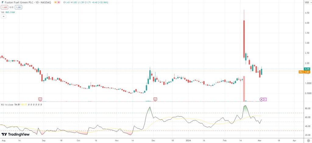 The shares of Fusion Fuel Green PLC (HTOO) closed 32.56% ($0.42) higher at $1.71 on Nasdaq on Monday, as they reversed a loss from the previous market session.