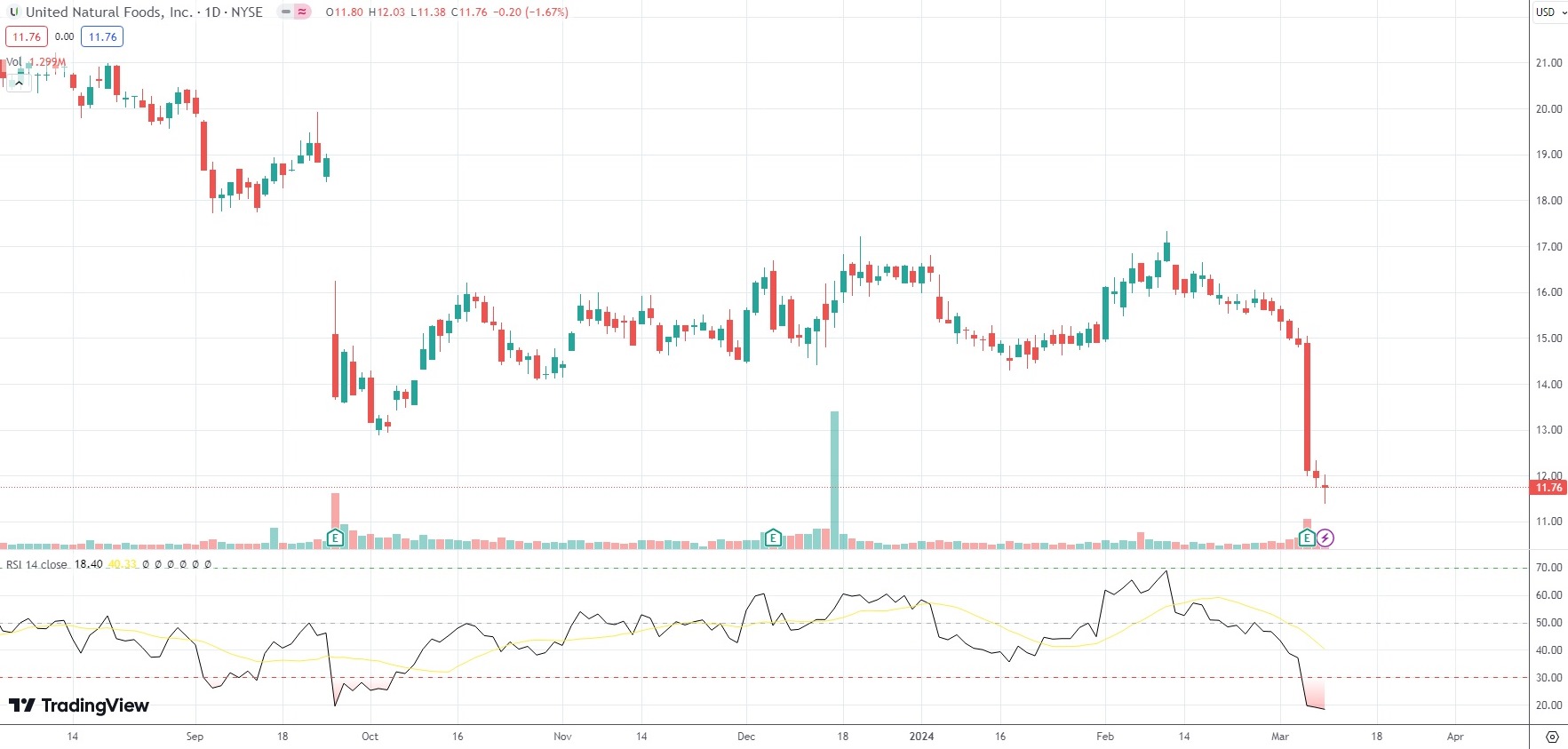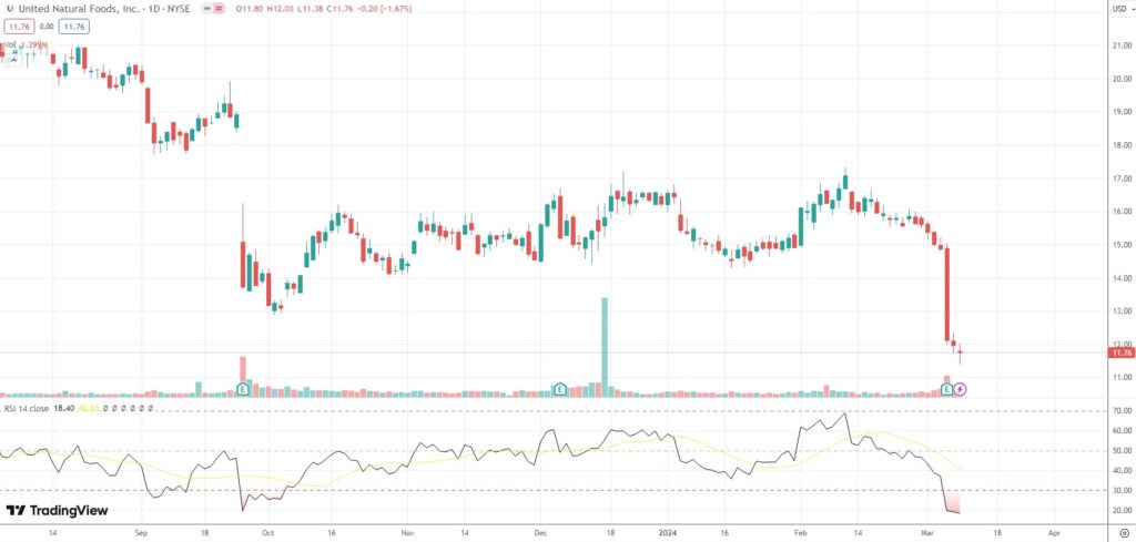 The shares of United Natural Foods Inc (UNFI) went down 58.07% in 2023, compared with a 10.99% gain for the benchmark index, NYSE Composite (NYA).