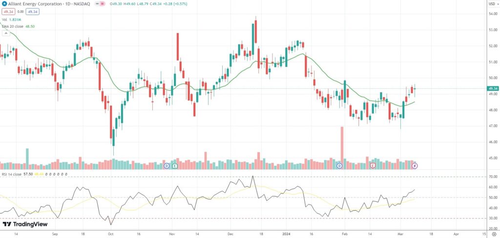 The shares of Alliant Energy Corp closed 0.57% ($0.28) higher at $49.34 on Nasdaq on Friday, as they extended the gains from the previous two market sessions.