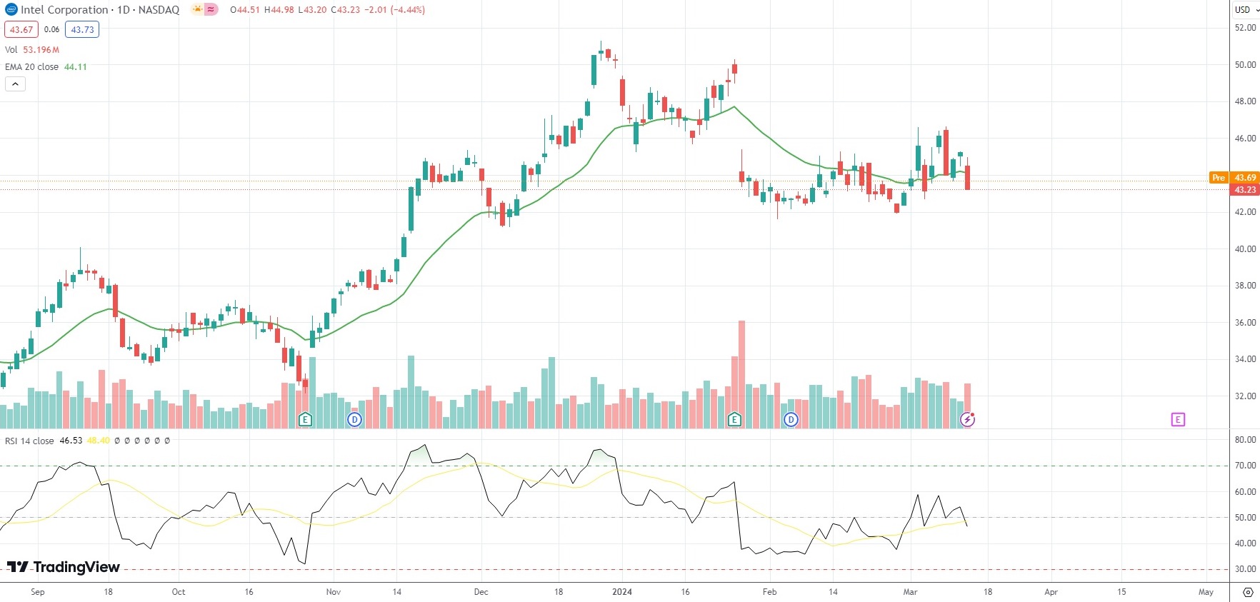 The shares of Intel Corporation (INTC) closed 4.44% ($2.01) lower at $43.23 on Nasdaq on Wednesday, as they snapped a two-day streak of gains.
