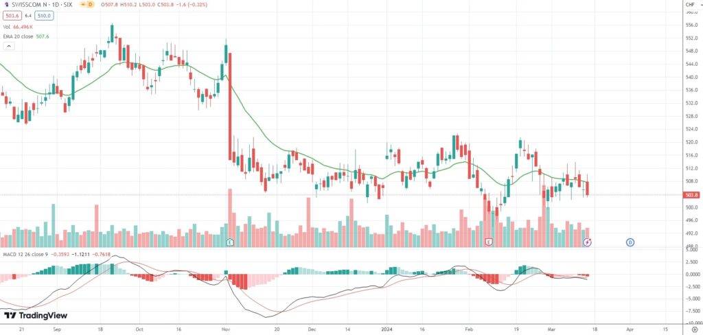 The shares of Swisscom AG (SCMN) closed 0.32% (CHF 1.60) lower at CHF 503.80 on Thursday, as they extended the losses from the previous two market sessions.