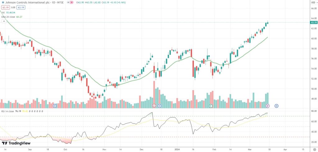 The shares of Johnson Controls International PLC (JCI) closed 0.16% ($0.10) higher at $63.19 in New York on Friday, as they extended the gains from the previous three market sessions.