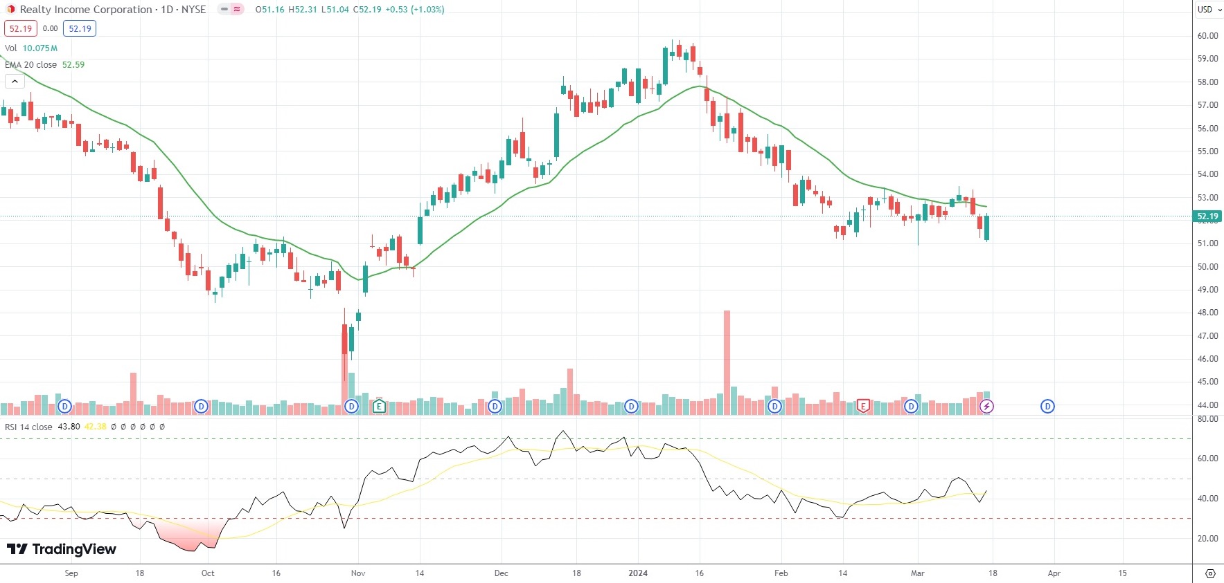 The shares of Realty Income Corporation (O) closed 1.03% ($0.53) higher at $52.19 in New York on Friday, as they snapped a three-day streak of losses.