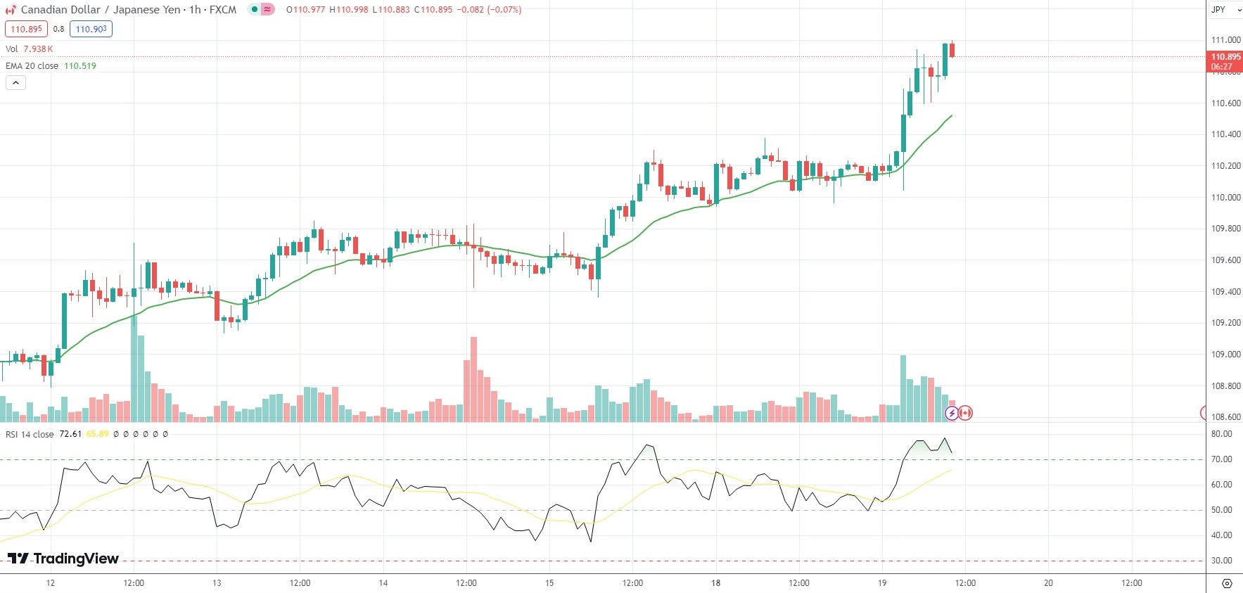 As of 10:53 GMT on Tuesday the CAD/JPY currency pair was gaining 0.63% to trade at 110.895.
