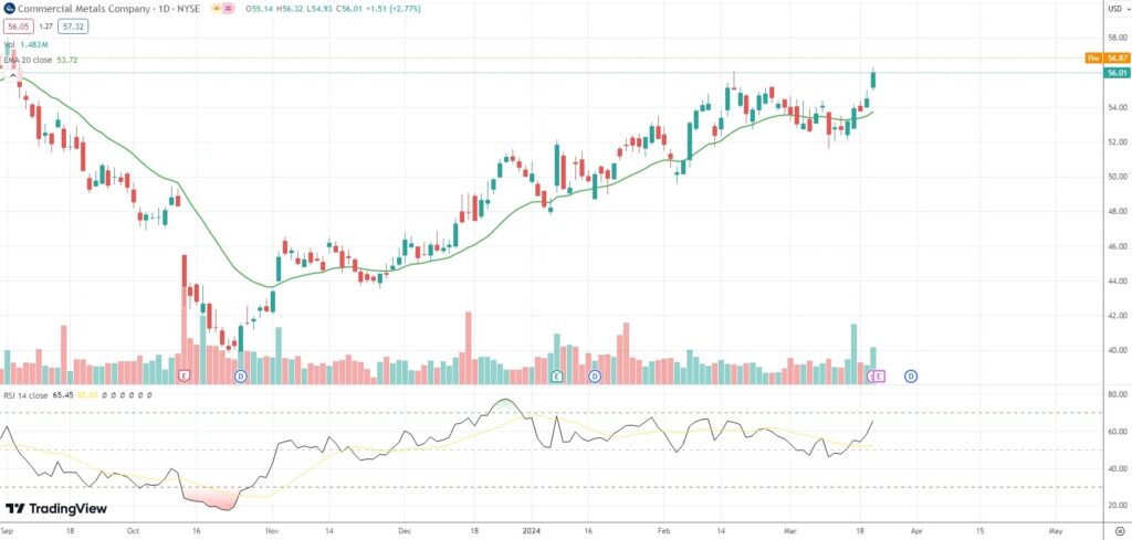 The shares of Commercial Metals Company (CMC) closed 2.77% ($1.51) higher at $56.01 in New York on Wednesday, as they extended the gain from the previous market session.