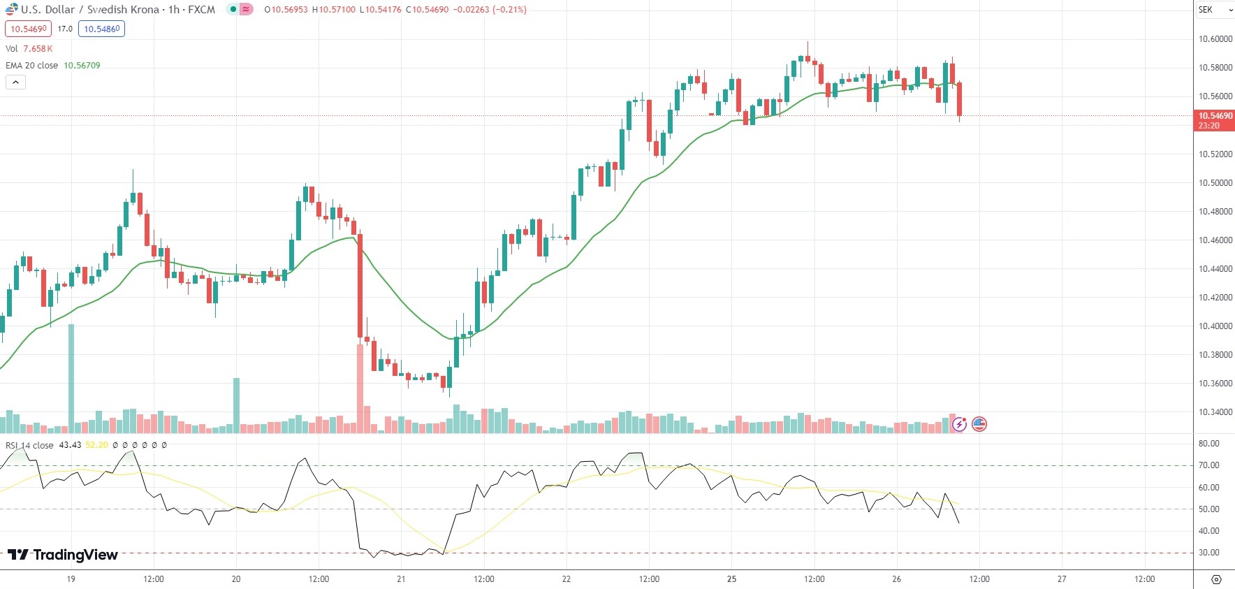As of 9:35 GMT on Tuesday the USD/SEK currency pair was edging down 0.10% to trade at 10.5464.