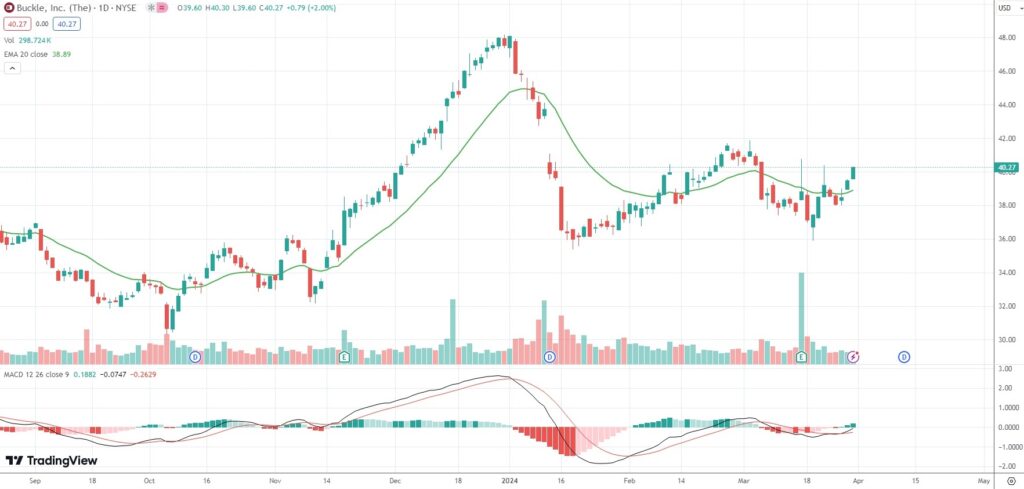 The shares of The Buckle Inc (BKE) closed 2.00% ($0.79) higher at $40.27 in New York on Thursday, as they extended the gains from the previous two market sessions.