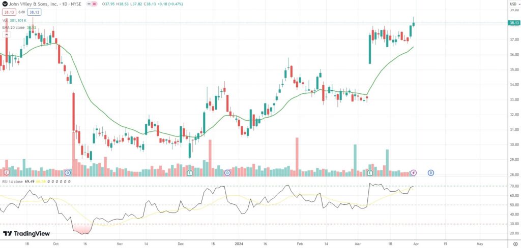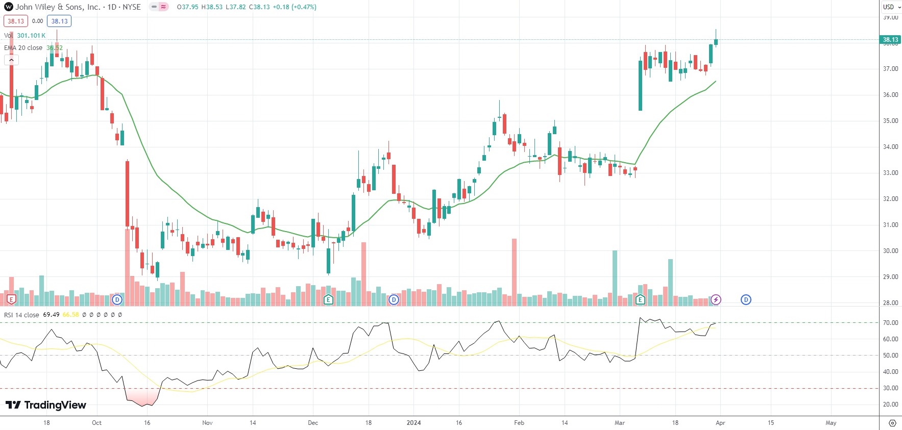 The shares of John Wiley & Sons (WLY) closed 0.47% ($0.18) higher at $38.13 in New York on Thursday, as they extended the gain from the previous market session. This has been the highest closing price since June 9th 2023.