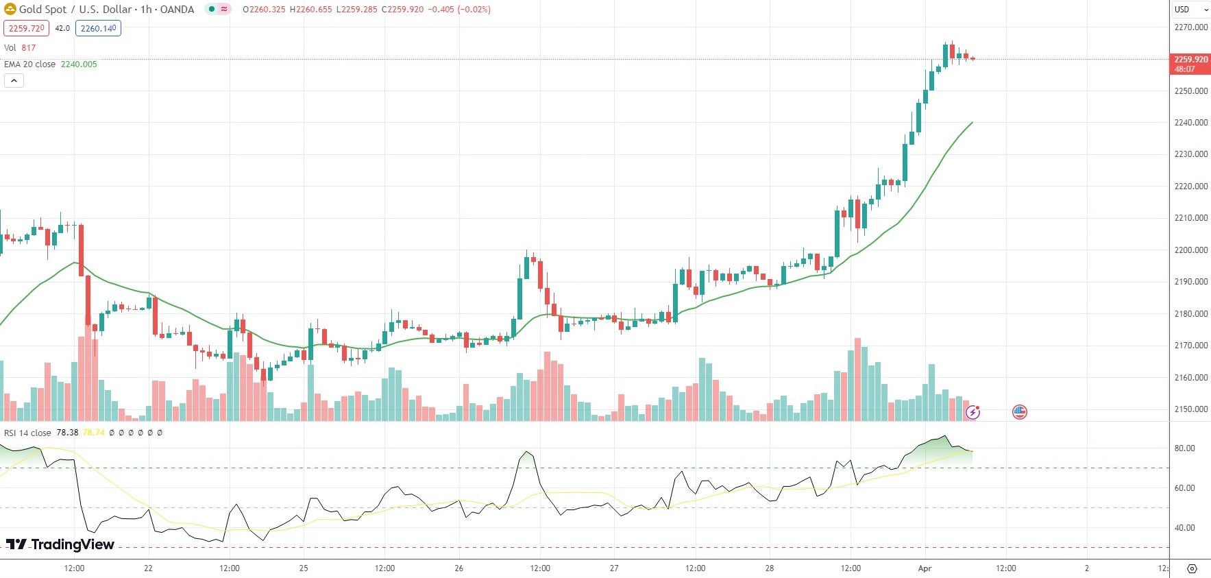 As of 7:11 GMT on Monday Spot Gold was gaining 1.20% to trade at $2,259.95 per troy ounce.