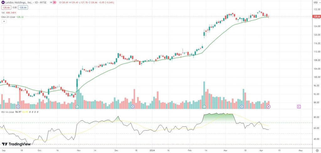 The shares of Leidos Holdings Inc (LDOS) closed 0.04% ($0.05) lower at $128.66 in New York on Friday, as they extended the loss from the previous market session.