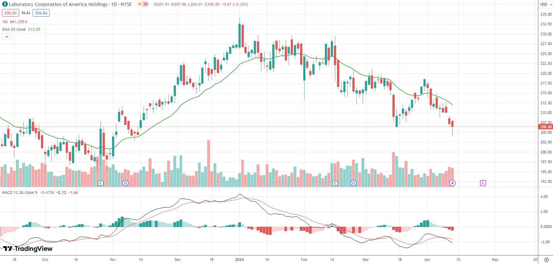 The shares of Laboratory Corporation of America Holdings (LH) closed 0.32% ($0.67) lower at $206.50 in New York on Thursday, as they extended the losses from the previous three market sessions.