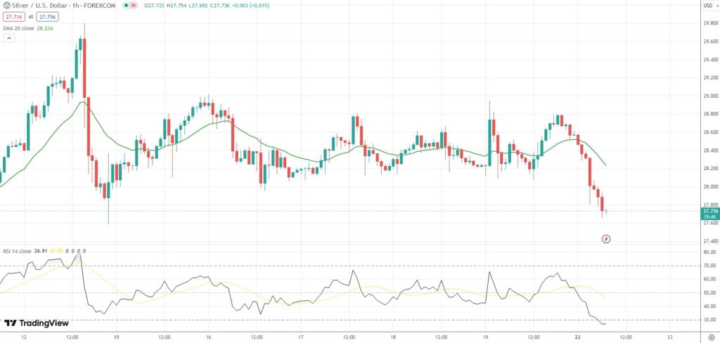 As of 7:19 GMT on Monday Spot Silver was losing 3.36% to trade at $27.718 per troy ounce.