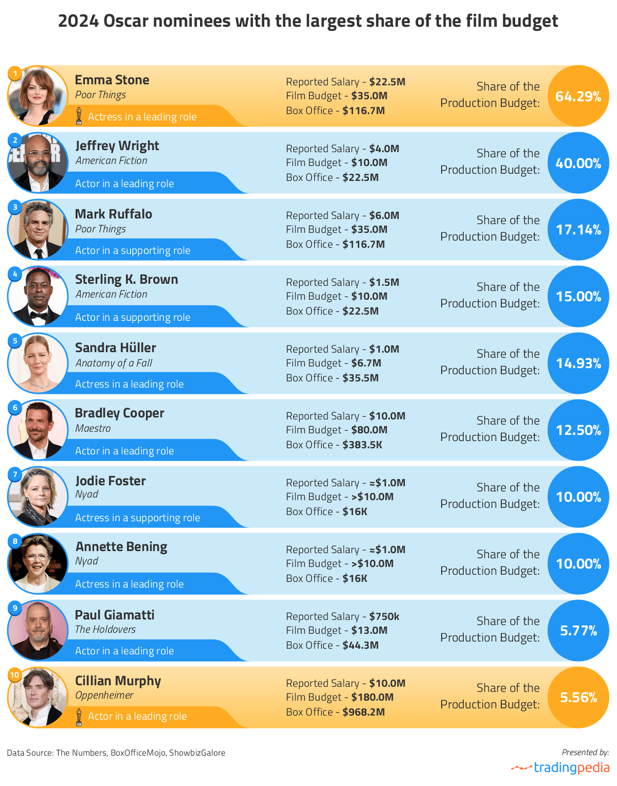 When it comes to this year’s Academy Award nominees and winners, however, certain salaries do seem odd. When we compare actors’ earnings to the film budgets, Emma Stone emerges as the one who got the lion’s share. Poor Things’ budget of $35 million is only slightly bigger than what she received ($22.5 million) according to the rumors. Her earnings equal a massive 64.29% of the production budget.