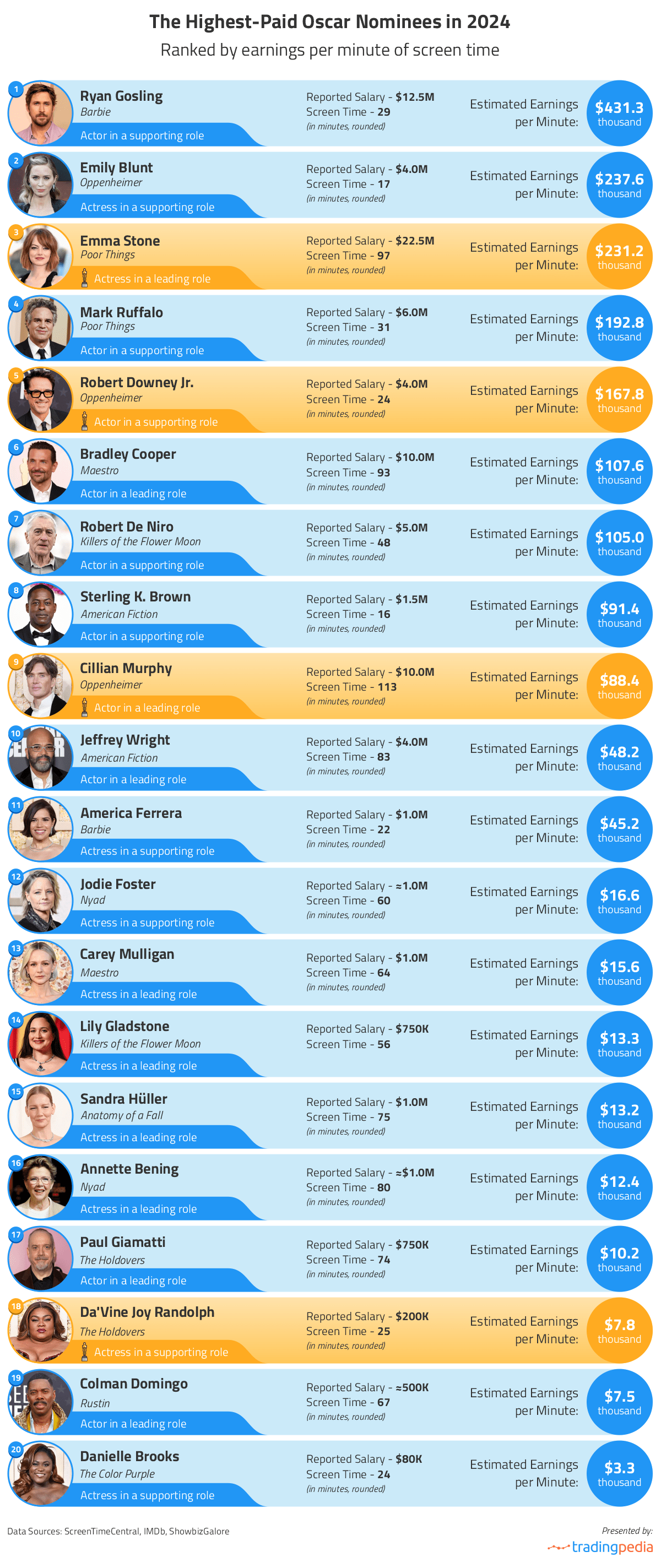We looked at the 2024 Academy Awards nominees’ reported salaries and calculated how much they have made per minute of screen time. According to our research, fame seems to be directly linked to an actor’s paycheck; not the time you are shown on screen. Bradley Cooper (Maestro), the actor seen the most as a percentage of the film’s entire runtime (72.05%), ranks 6th when it comes to earnings per minute.
