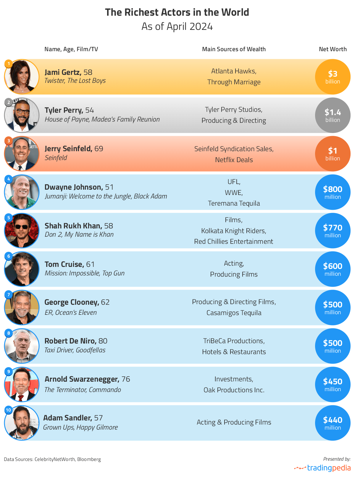 Moreover, the richest actors’ main sources of wealth rarely include earnings from acting jobs. Only three actors and actresses have a net worth estimated at $1 billion or more. The person with the most impressive wealth is actress Jami Gertz, known for her roles in Twister (1996) and The Lost Boys (1987). In 2001, she received a Primetime Emmy nomination for Outstanding Guest Actress in a Comedy Series for portraying Kimmy Bishop in Fox’s hit series Ally McBeal.