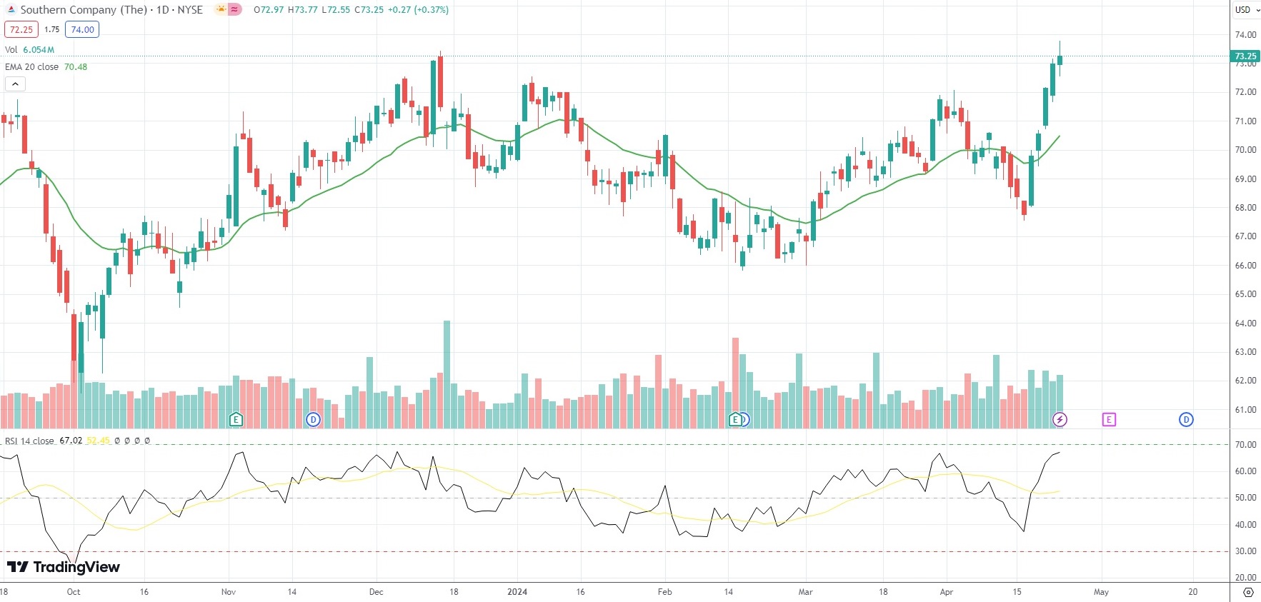 The shares of Southern Company (SO) closed 0.37% ($0.27) higher at $73.25 in New York on Tuesday, as they extended the gains from the previous four market sessions.