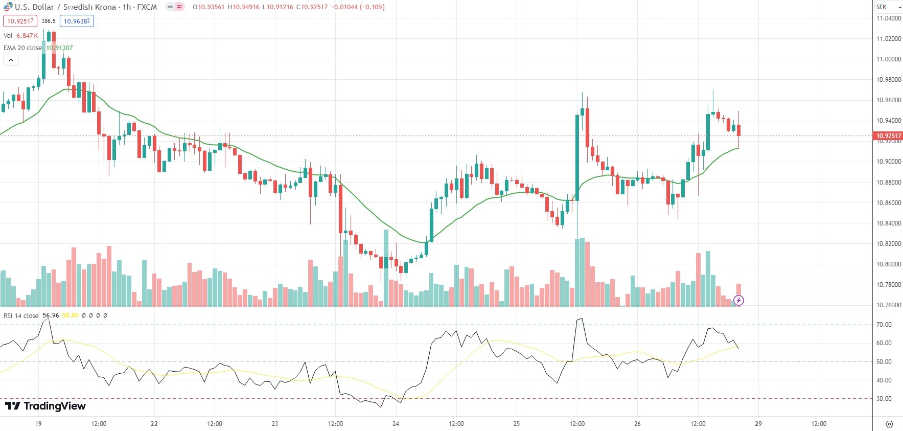 The USD/SEK currency pair settled 0.52% higher at 10.9252 on Friday. For the week, the exotic currency pair edged up 0.20%, while extending the gains from the previous two weeks.