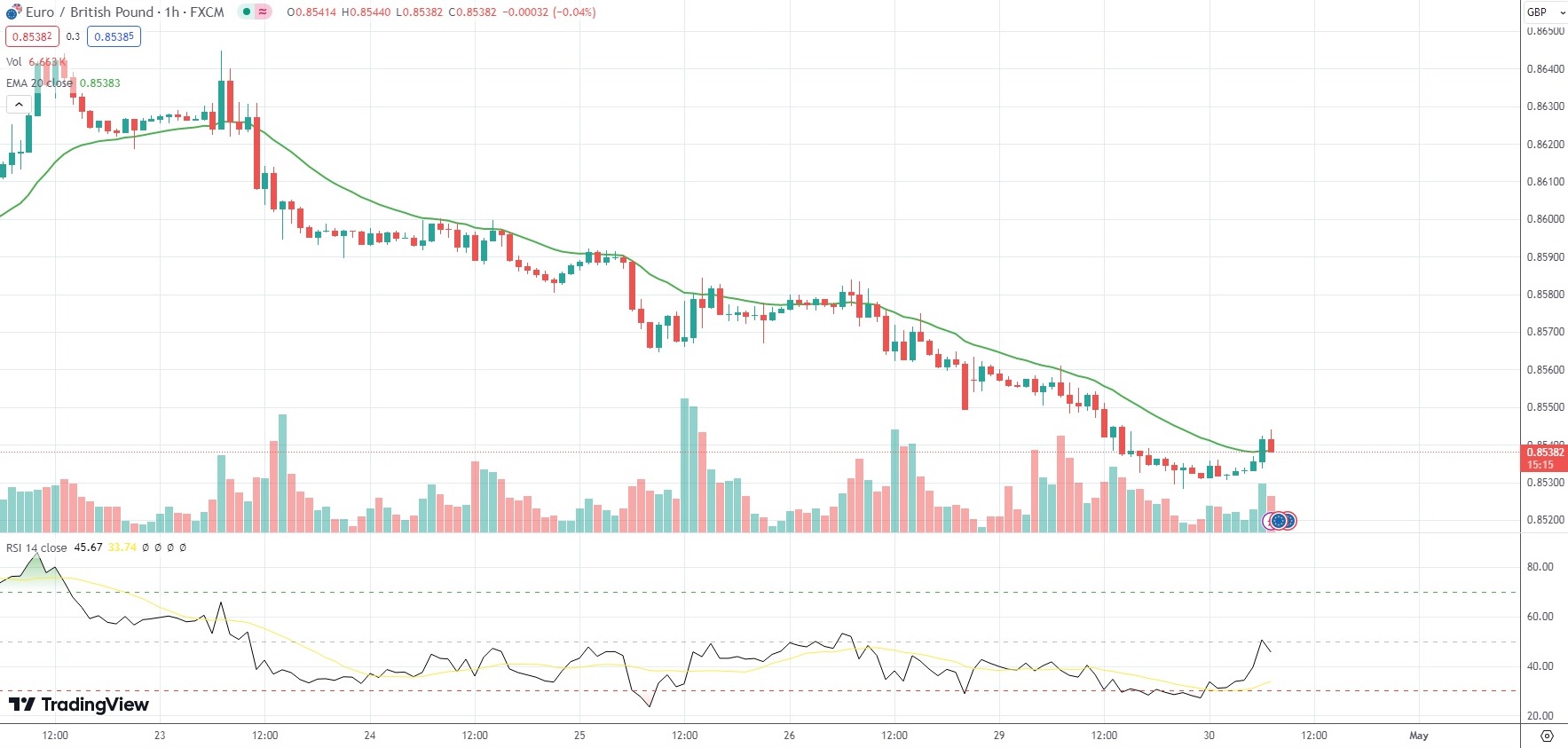 The Euro was 0.06% firmer on the day against the British Pound, with the EUR/GBP currency pair last trading at 0.8538.