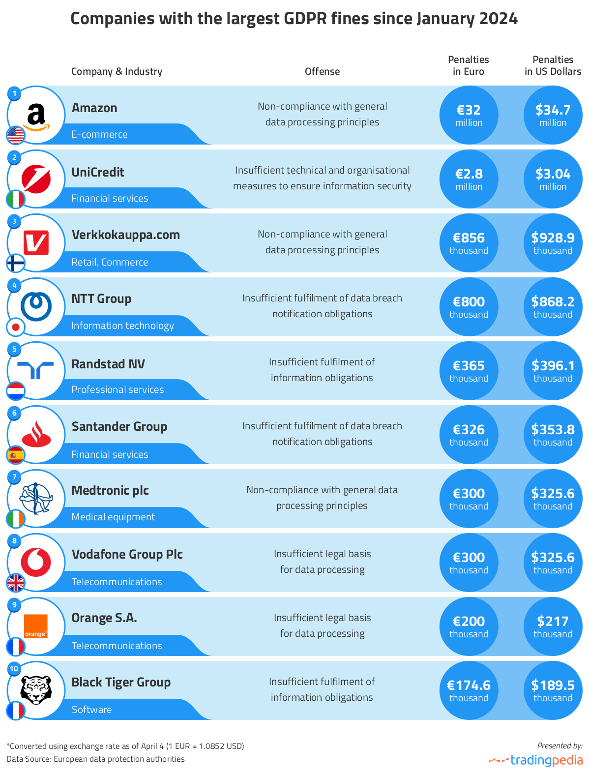 Eager to find the top GDPR offenders and lawbreakers as of this year so far, our team crawled through the GDPR Enforcement Tracker. It provides an overview of reported fines and penalties EU data protection authorities have imposed to date. We only gathered fines levied since the beginning of 2024 and ranked the companies based on how much they have been ordered to pay.