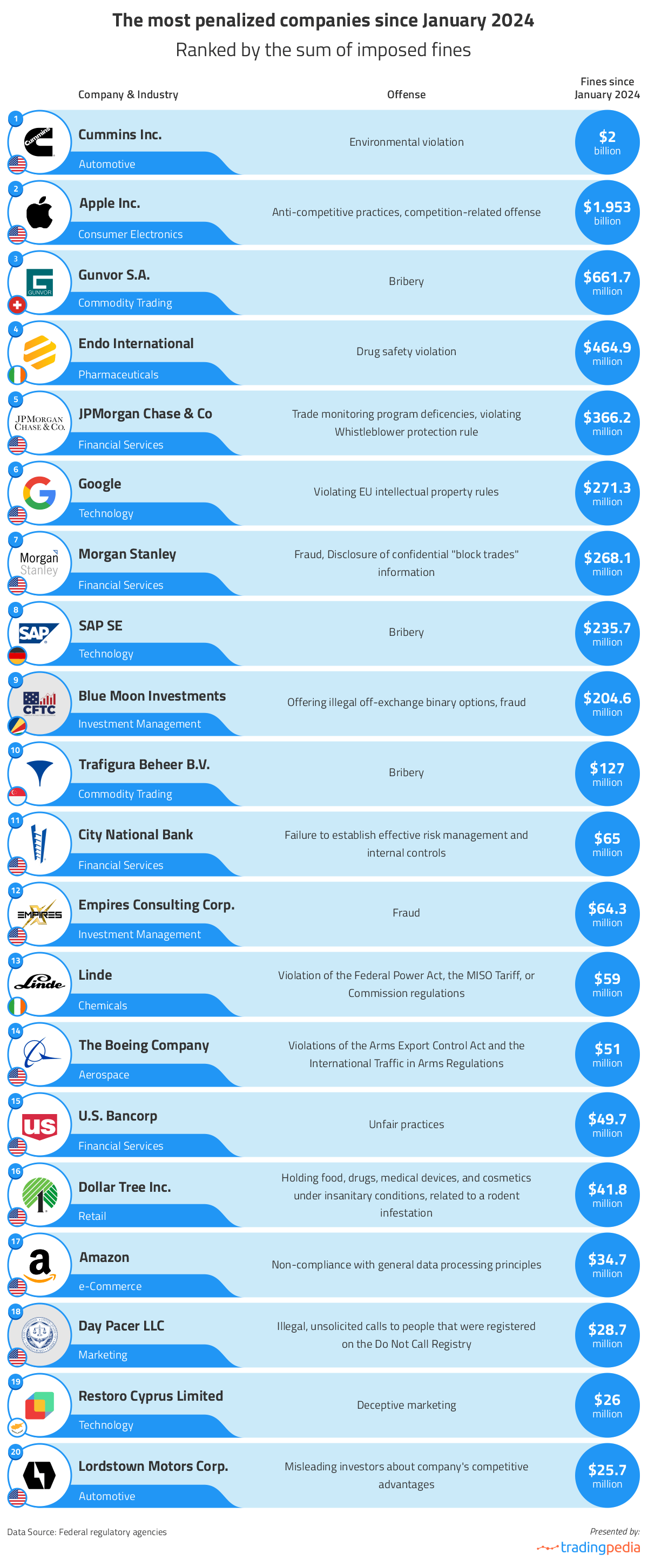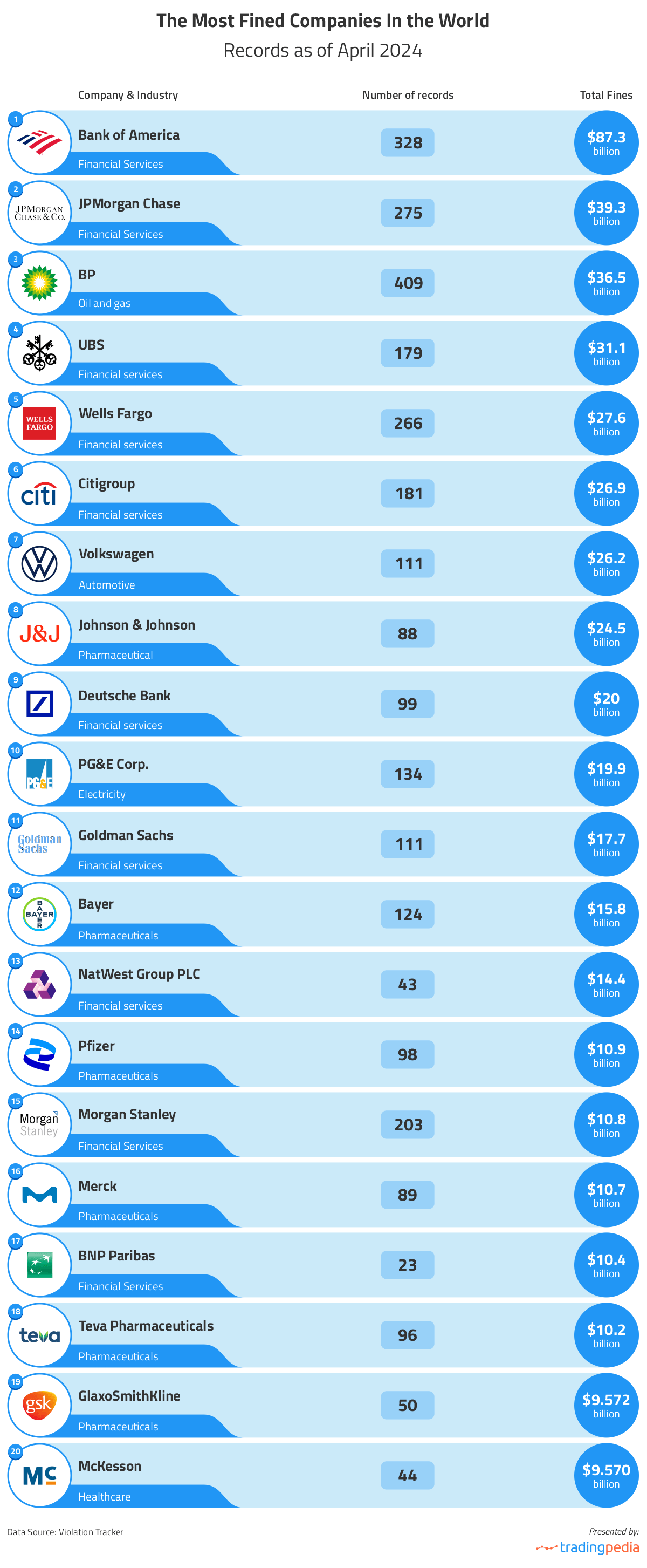 The Bank of America stands as the company which has been fined the most over the last two decades. It has paid a total of $87.3 billion across 328 individual fines, primarily stemming from violations related to investor and consumer protection Following closely is another financial giant, JPMorgan Chase, which has been forced to pay $39.3 billion over the years as part of 275 fines. BP (formerly known as British Petroleum) ranks third, having paid $36.5 billion across 409 individual fines. Apparently, the most fined businesses are mainly in the financial and pharmaceutical sectors.