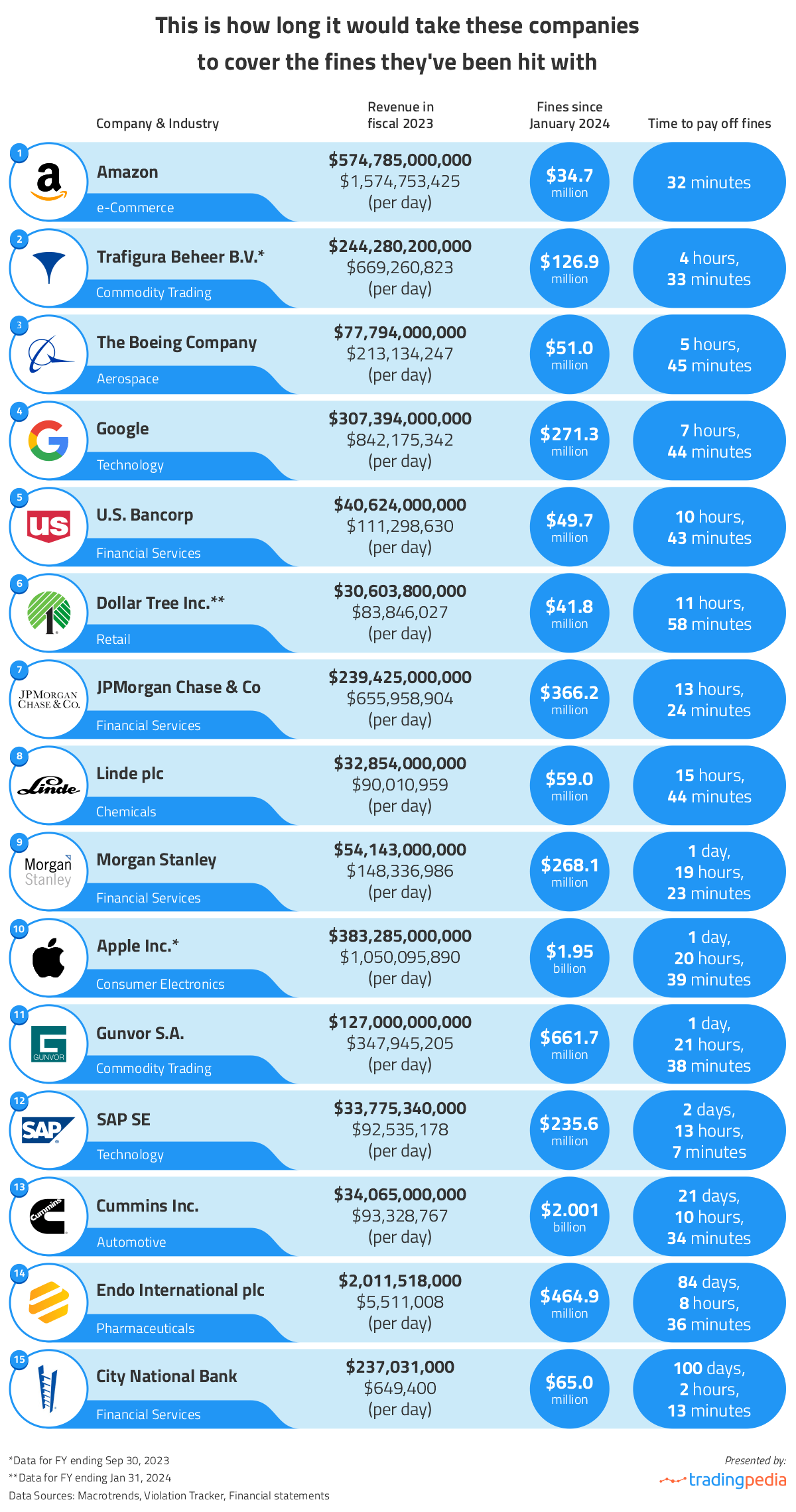 In addition, we estimated the average daily revenue for the companies on the list using their annual revenue from the fiscal year ending December 31, 2023, unless noted otherwise. This allowed us to check how long it would take each company to pay off all fines incurred since January 2024.