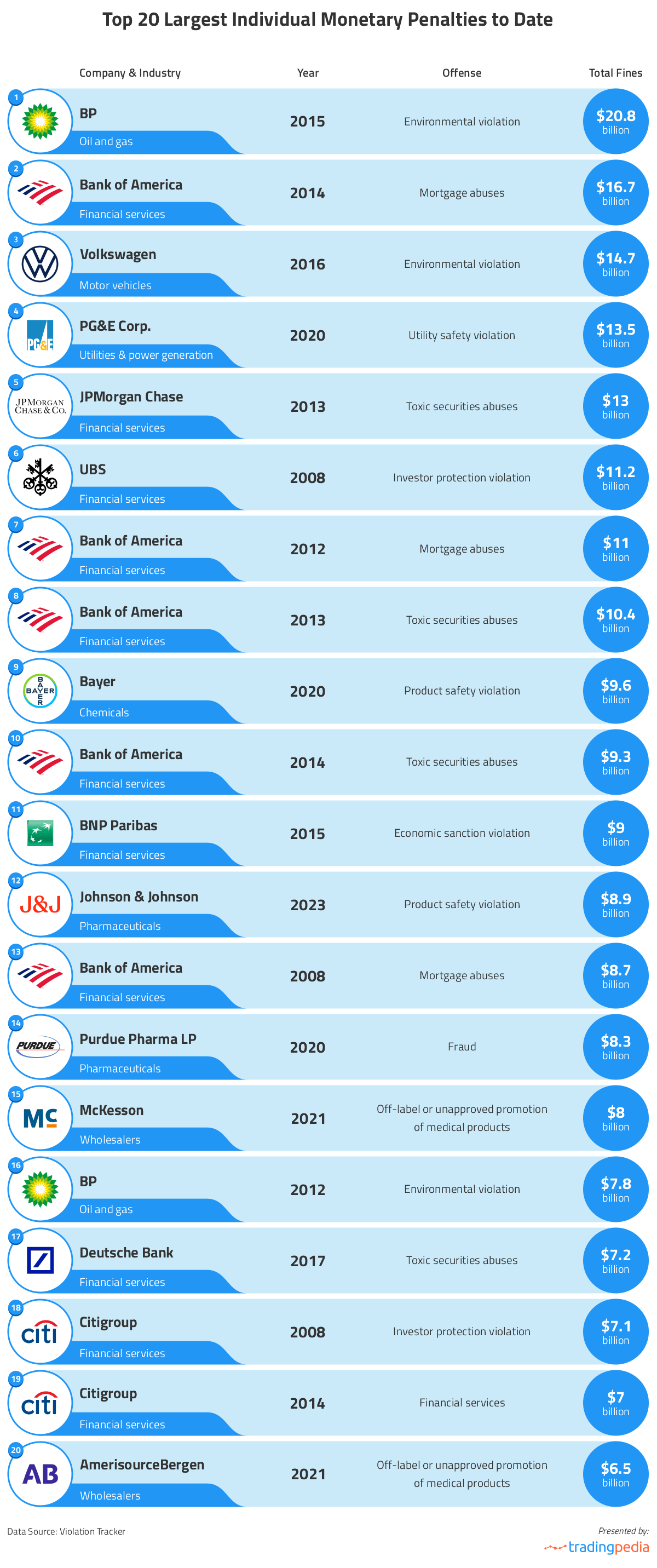 The team at Tradingpedia also turned to Violation Tracker, the first wide-ranging database on corporate misconduct, and compiled lists of the 20 most fined companies to date as well as the 20 largest monterey penalties since 2000.