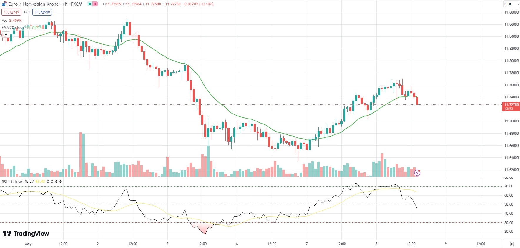 The Norwegian Krone was little changed on the day against the Euro, with the EUR/NOK currency pair last trading at 11.7270.