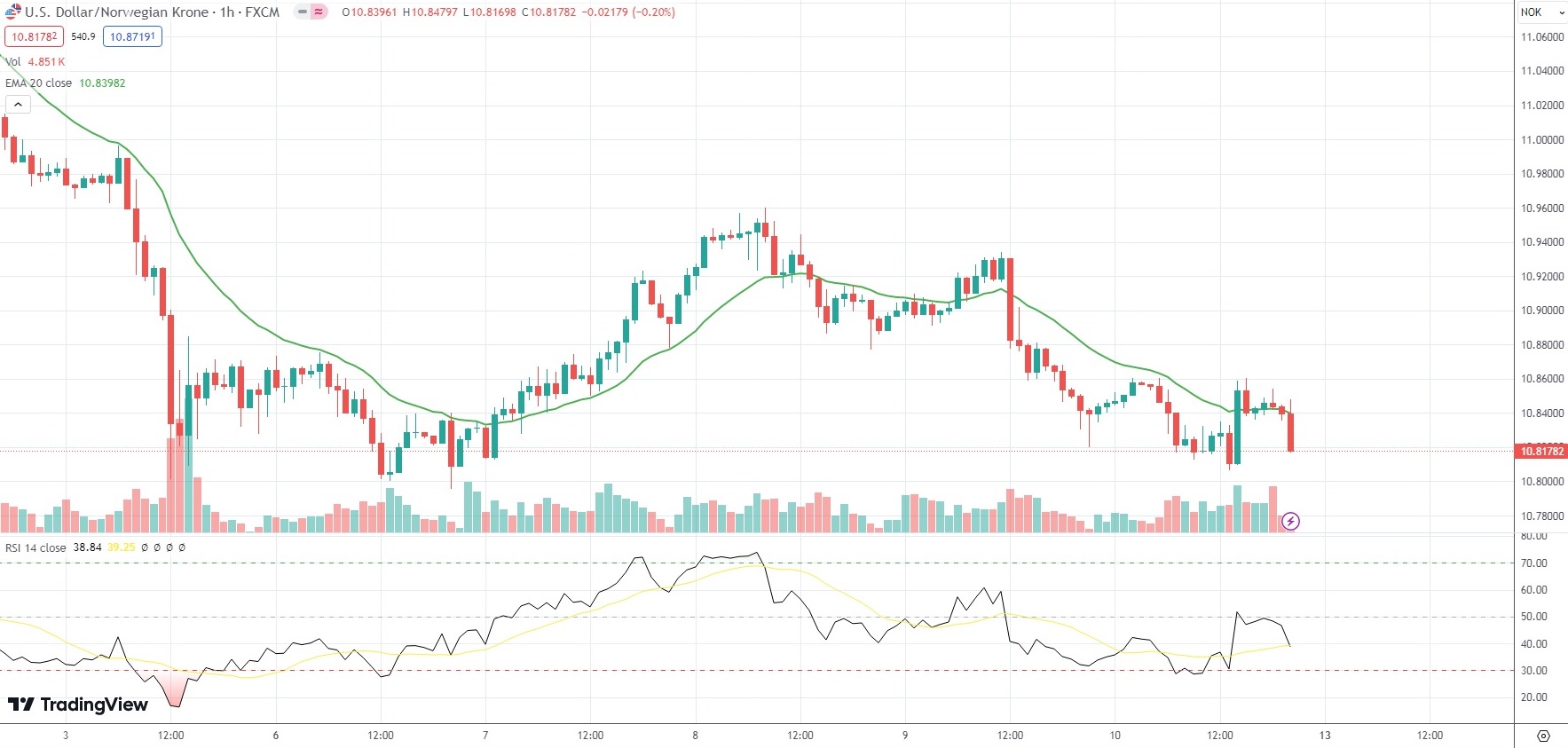 The USD/NOK currency pair settled 0.22% lower at 10.8178 on Friday. For the week, the exotic currency pair edged down 0.23%, as it extended the loss from the prior week.
