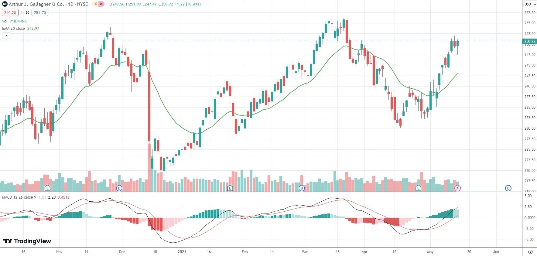 The shares of Arthur J. Gallagher & Co (AJG) closed 0.49% ($1.22) higher at $250.72 in New York on Tuesday, as they reversed a loss from the previous market session.