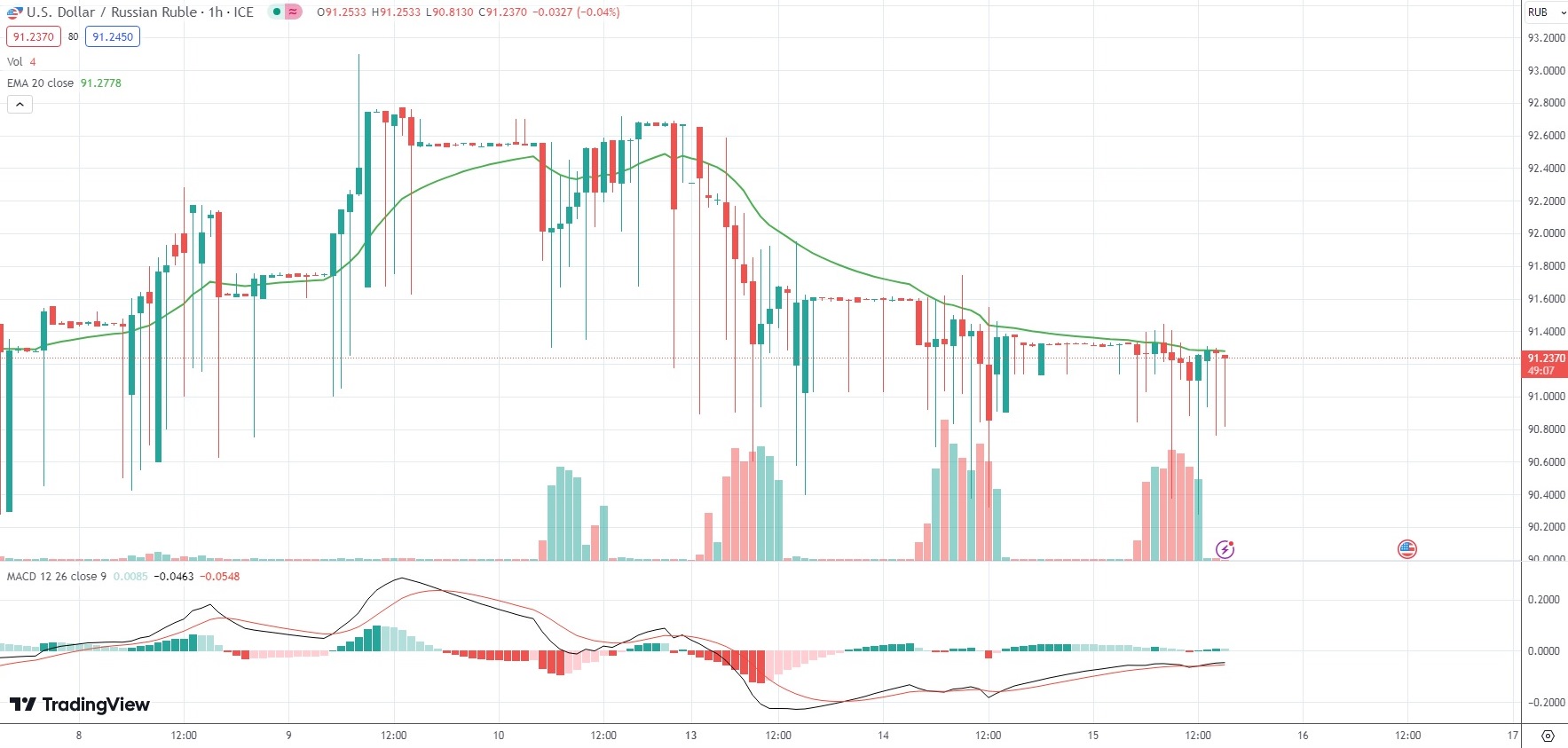 The Russian Ruble was last 0.09% firmer on the day against the US Dollar, with the USD/RUB currency pair trading at 91.2370.
