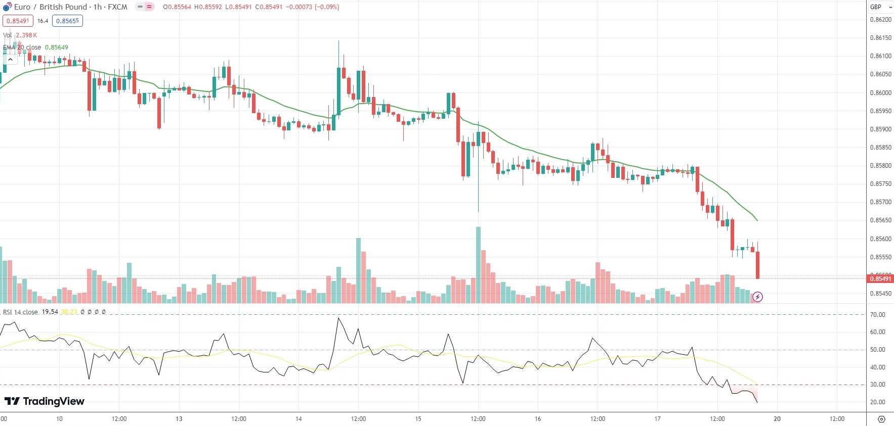 The EUR/GBP currency pair settled 0.33% lower at 0.8549 on Friday. For the week, the minor currency pair retreated 0.48%, as it snapped a two-week streak of gains.